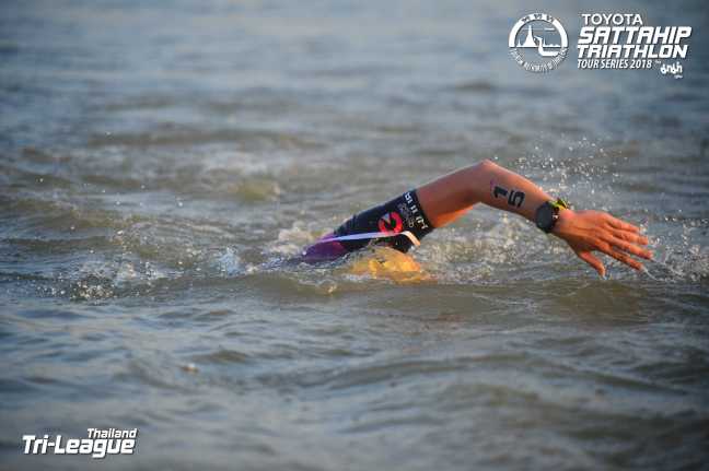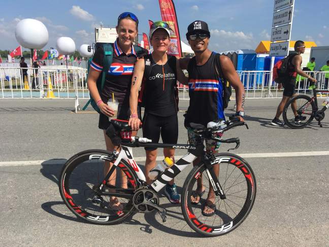 The overall competitors were to start in the water followed by an age group rolling start. I had entered the overall race which seems to be fairly common in Thailand. Treading water in the lake/lagoon confirmed that the water was not too hot (phew!) but with zero visibility it was going to be difficult to stick on feet. After a rough start being hit over the head and losing the pack I found myself on the national TT Taiwanese champion who I had heard was also strong swimmer. But soon she slowed down or I found my rhythm and decided to make the jump to the group ahead. A small group of two one of which turned out to be Ray (No1 Thai triathlete and fellow Z coaching athlete). The swim seemed to go on for hours, and was confirmed with everyone getting slightly slower times than expected. Climbing out was a challenge with ropes provided for assistance! I was announced as 2nd female out of the water and so raced to get the swimskin off and helmet on ready to bike.